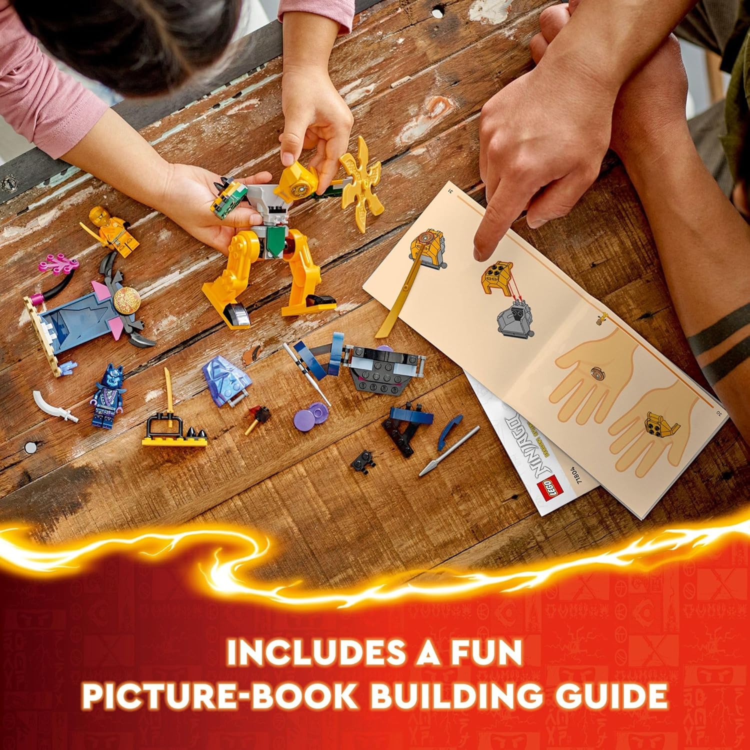 - 2 minifiguras LEGO Ninjago: el juego Ninja incluye una minifigura Arin armada con un accesorio de katana para que los niños puedan jugar a la acción contra el guerrero máscara de lobo con su espada